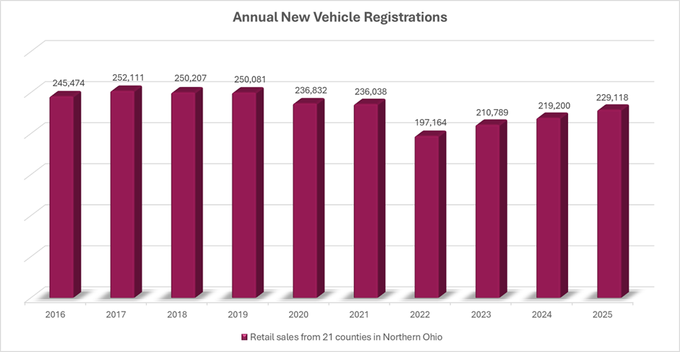Retail sales figures are based on vehicle registration reports from the Ohio Bureau of Motor Vehicles. Vehicle sales data includes all dealers in these 21 counties: Ashland, Ashtabula, Carroll, Columbiana, Coshocton, Cuyahoga, Erie, Geauga, Holmes, Huron, Lake, Lorain, Mahoning, Medina, Portage, Richland, Stark, Summit, Trumbull, Tuscarawas and Wayne.
